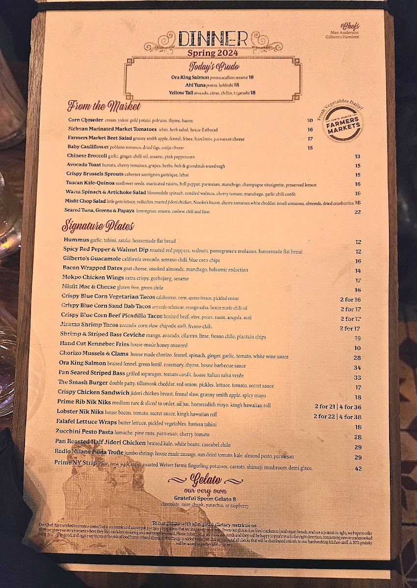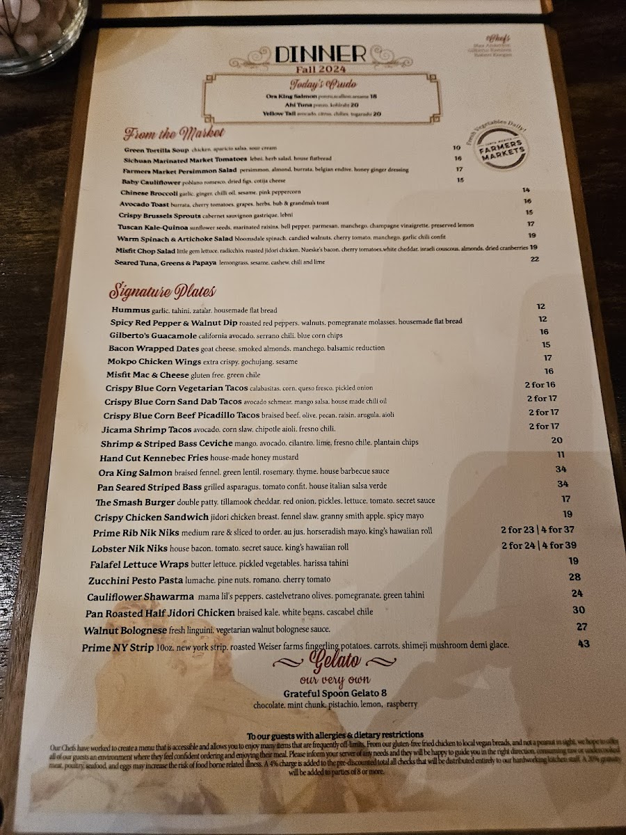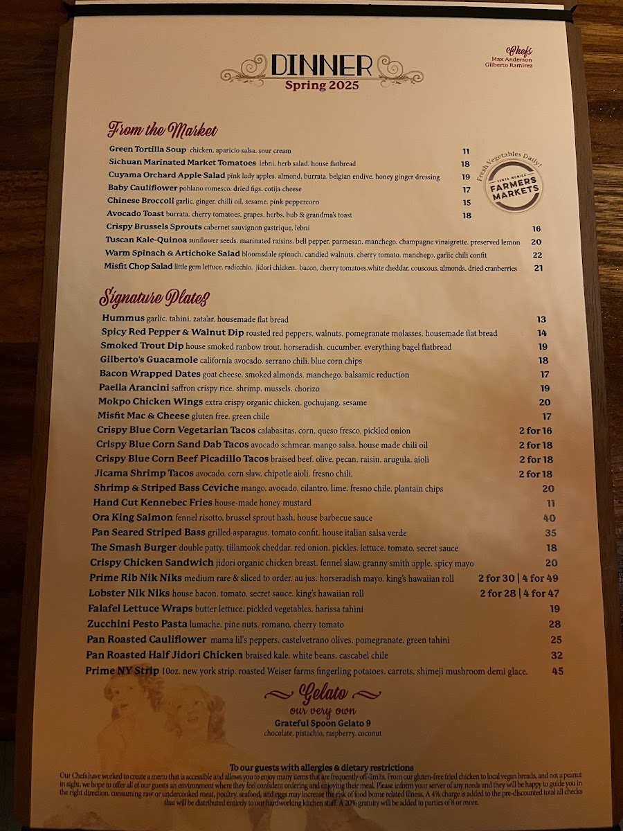 The cuisine at The Misfit is a celebration of bold flavors and inventive dishes. Start your culinary journey with the Spicy Red Pepper & Walnut Dip, served with housemade flatbread that perfectly complements the rich, roasted pepper notes. Or for a lighter yet equally satisfying option, the Peruvian Ceviche is a must-try, featuring fresh jumbo shrimp married with bright lime and enticing Szechuan chile for a delightful kick.